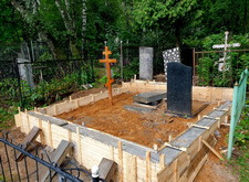 Затем наступил самый ответственный этап работы: монтаж ограждение. Работа по его установке опять-таки заняла достаточно долгое время, однако в результате чего по периметру могилы была установлена достаточно высокая статусная металлическая ограда, сразу же выделяющая место захоронения на фоне других участков. На фотографиях ниже представлен окончательный внешний вид могилы с разных ракурсов на момент завершения работ.