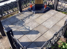 Дожидаемся высыхания бетонной плитки, затем проверяем её на прочность. Покрытие не поддаётся внешнему воздействию, а значит цемент успешно застыл и плитка надёжно зафиксирована на могиле. Фотографируем окончательное состояние места захоронения.